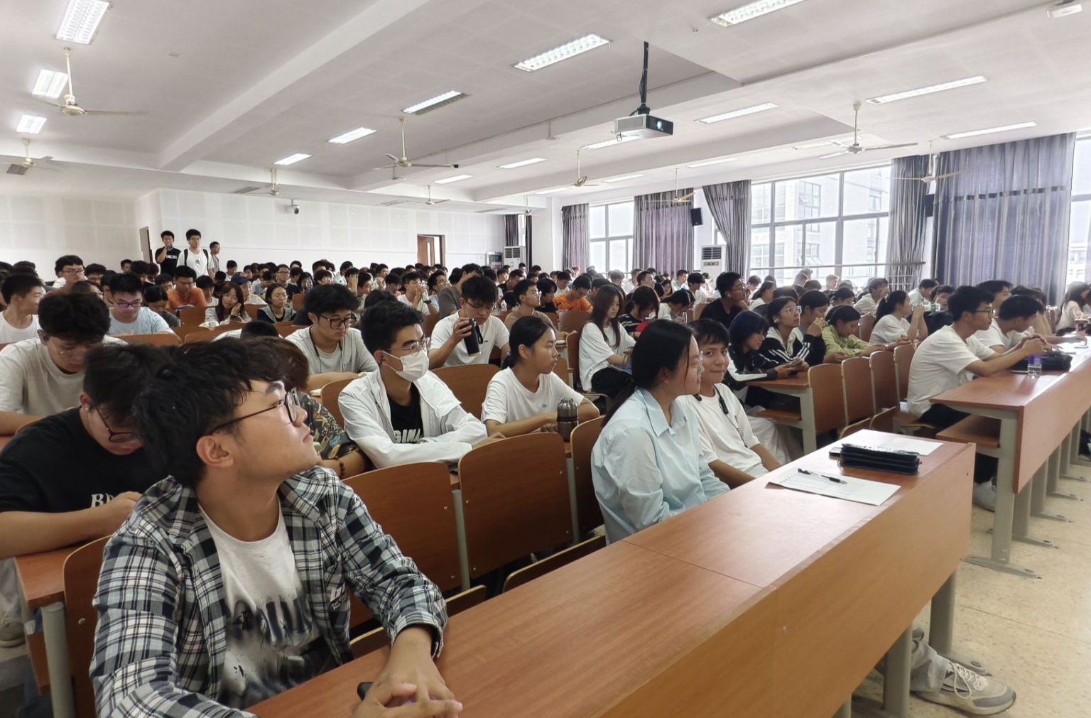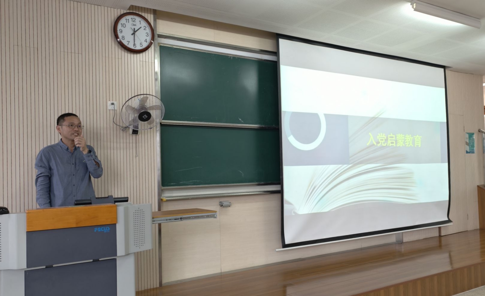 10月15日下午,理学院本科新生入党启蒙教育在第一教学楼A410举行。理学院党委副书记兼副院长董小平应邀主讲,2025级全体新生参与讲座。活动由2025级本科生辅导员王文元主持。