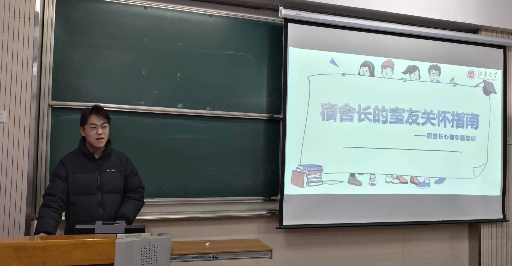 12月3日下午,理学院宿舍长心理健康专题培训会在1B215举行。本次培训以“宿舍长的室友关怀指南”为主题,旨在明确宿舍长心理关怀职责,提升其识别心理需求、提供科学支持、化解宿舍矛盾的能力,助力建设温暖安全的宿舍“小家庭”,夯实校园心理健康防护体系。辅导员王文元老师担任主讲,本科、预科生全体宿舍长参加活动。