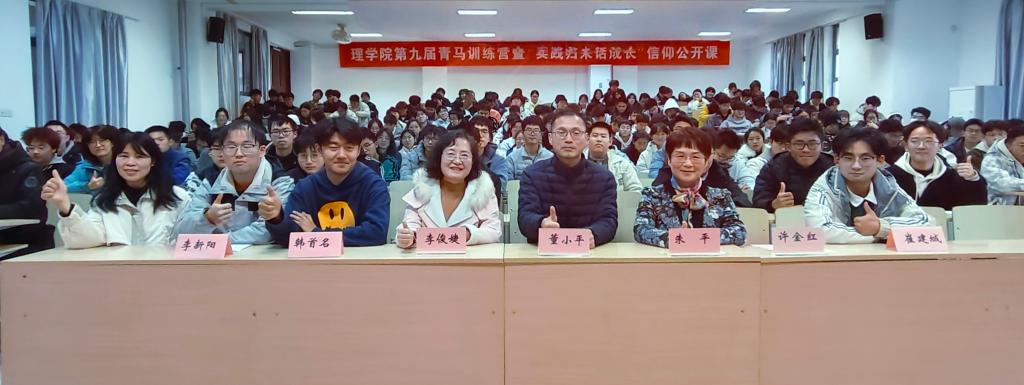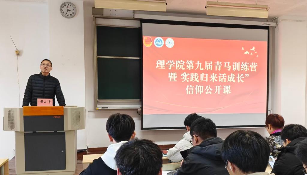 为深化青年思想政治引领,培育坚定的青年马克思主义者,12月3日下午,理学院在2D106教室举办第九届青马工程训练营暨“实践归来话成长”信仰公开课。理学院党委副书记、副院长董小平,特邀报告员、关工委委员朱平,关工委常务副主任李俊婕,学工办主任许金红出席活动,第八届青马训练营优秀学员、学生会骨干及 2025级学生等250余人参加活动。活动由学生会主席团成员柴承源主持。