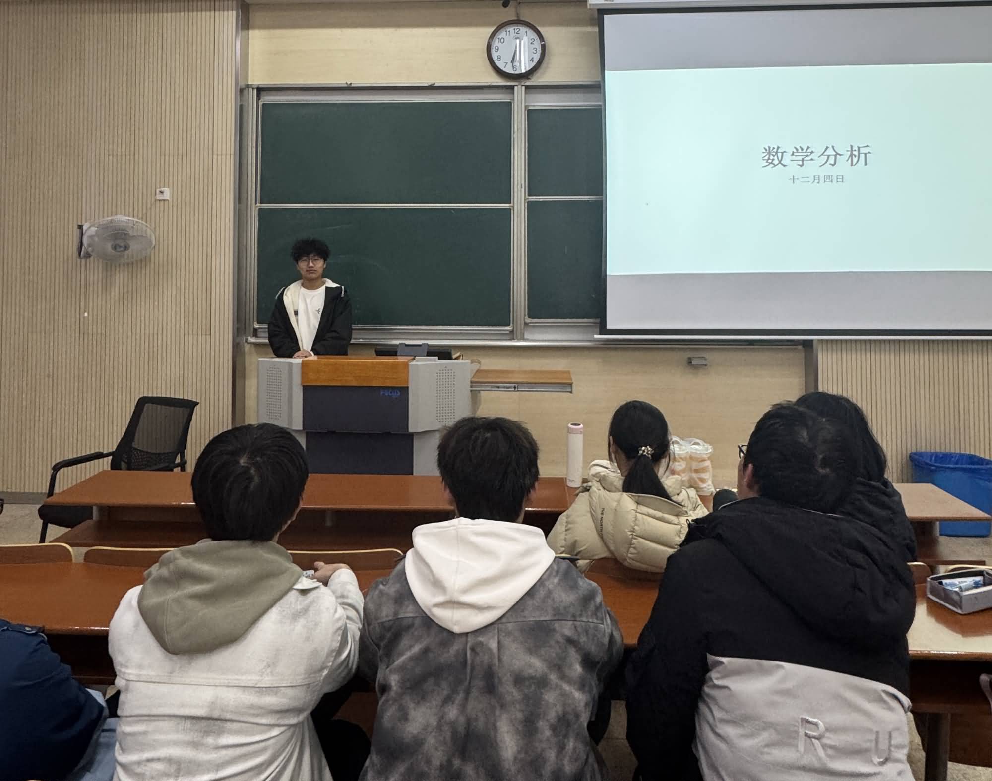 本期活动针对《数学分析》课程中抽象性强、理解难度较高的“极限与函数”部分展开系统讲解。王宇航同学在前期深入梳理课程知识体系、收集同学共性疑问的基础上,围绕极限的定义、性质、计算方法以及函数连续性、一致连续性等关键内容,进行了清晰的逻辑梳理与典例分析。讲解过程中,他注重从直观理解过渡到严格定义,结合几何解释与具体算例,帮助在场同学逐步突破认知难点。在互动环节,同学们积极参与,就不理解的问题展开讨论。现场学习氛围浓厚,形成了互问互答、共同探讨的良好机制。