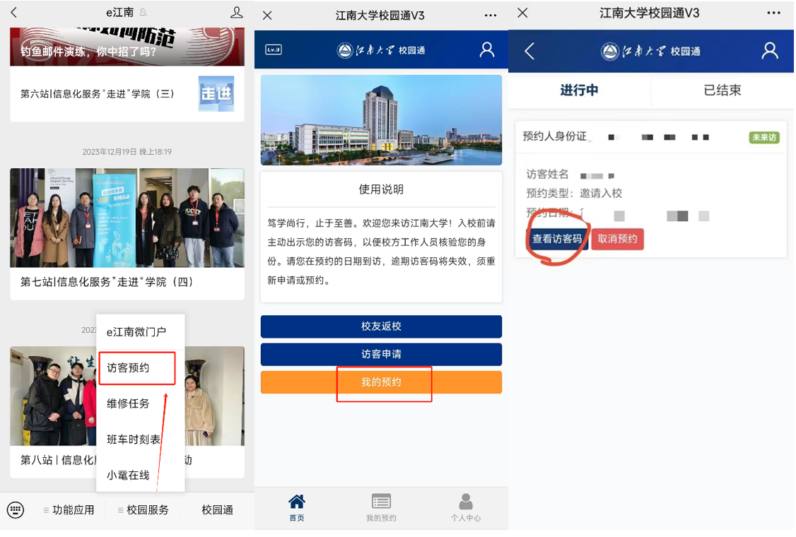 手机关注“e江南”微信公众号,点击屏幕下方“校园服务”中的“访客预约”,进入后点击“我的预约”,点击“查看访客码”即可获得访客码。进入校园时出示访客码。