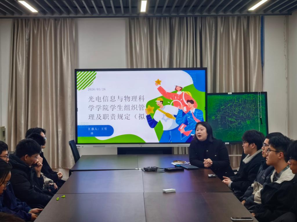 学生骨干是学院联系广大同学的桥梁纽带,是推动学生自我管理、自我服务、自我教育的中坚力量。会议围绕《光电信息与物理科学学院学生组织管理及职责规定》展开系统学习与专项解读。王雪冰结合学院学科特色与学生工作实际,对研究生会、学生会的组织架构、部门职责与核心管理制度作了整体介绍。她强调,本次会议不仅是新学院学生组织的首次正式工作会,也是学生骨干队伍在重组与招新后的一次重要的理念重塑、凝聚共识和系统学习会议。学生组织要在学院党委领导和团委指导下,坚持权责清晰、分工协作、精简高效的原则,聚焦学术科研、学风建设、生涯发展、志愿服务等重点领域,切实服务全院学生成长成才。